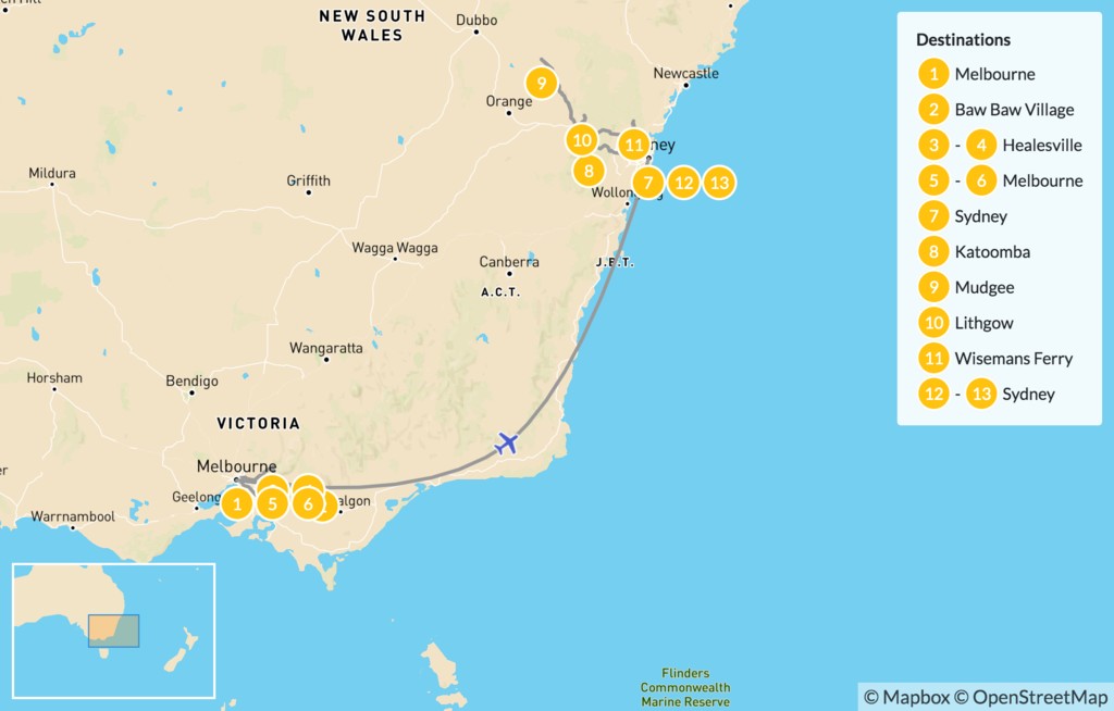Map of Self Drive Tour: Melbourne, Healesville, Blue Mountains, Sydney & More – 14 Days
