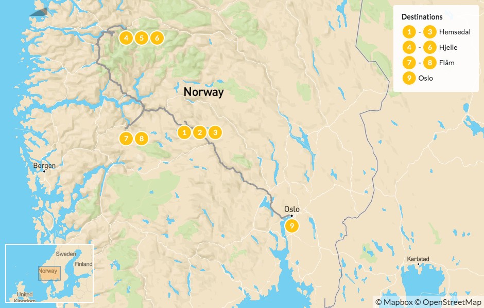 Map of Self-Drive Tour of Norway: Hemsedal, Hjelledalen & Flåm – 10 Days