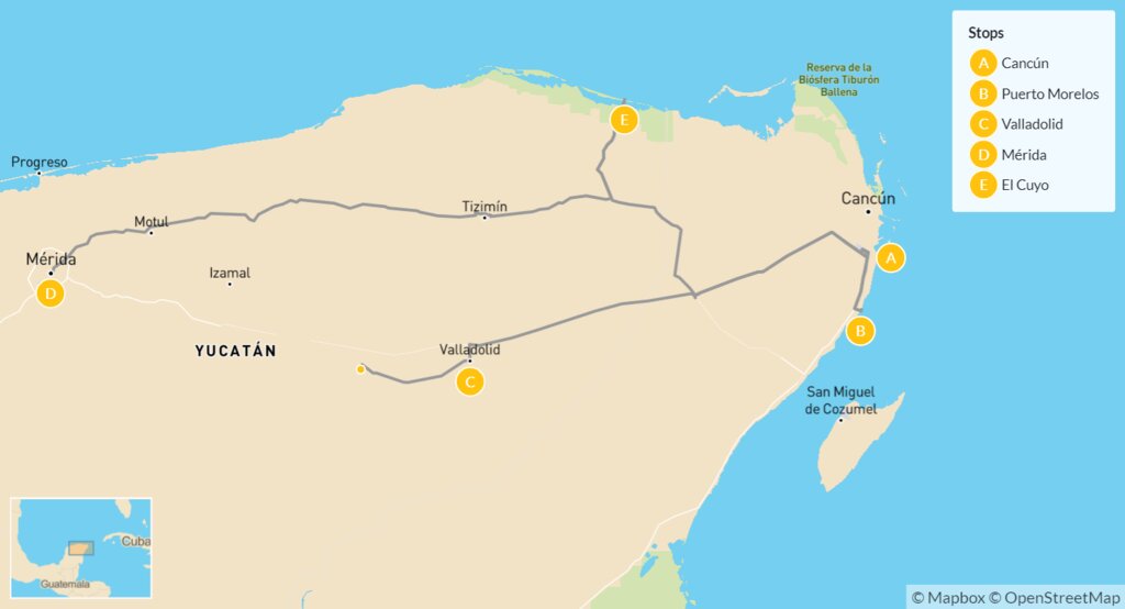 Map of Self-Drive Yucatán Discovery: Puerto Morelos, Valladolid, Mérida & El Cuyo – 10 Days