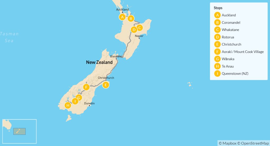Map of Self-Driving Tour of New Zealand’s Nature & Culture: Auckland to Queenstown – 18 Days