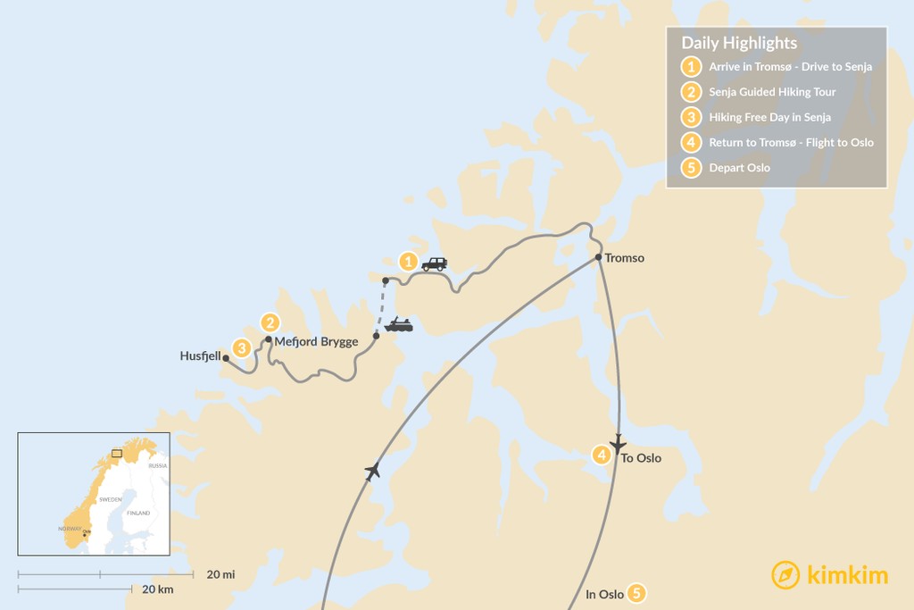 Map of Senja Island Summer Hiking Excursion – 5 Days