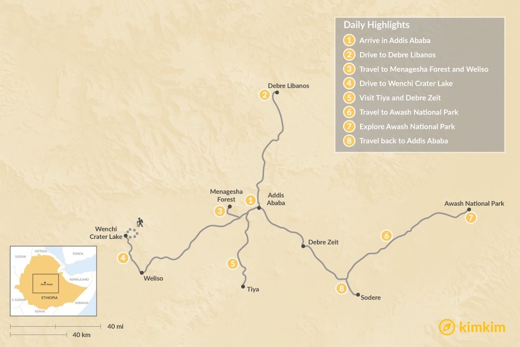 Map of Short Trips In and Around Addis Ababa – 8 Days