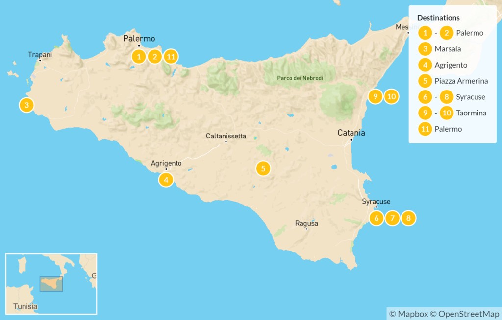 Map of Sicily Highlights Self-Drive Tour – 12 Days