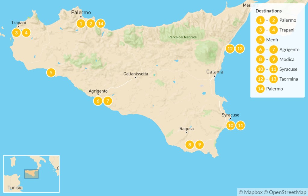 Map of Sicily Highlights Self-Drive Tour – 15 Days