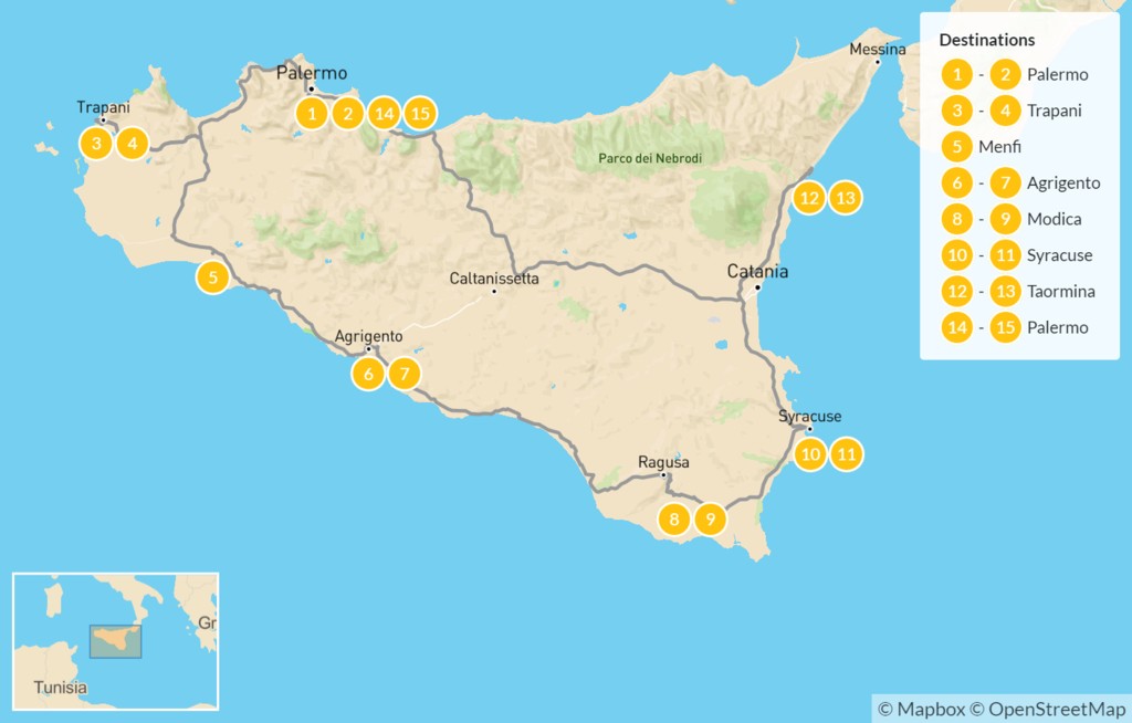 Map of Sicily Highlights Self-Drive Tour – 16 Days