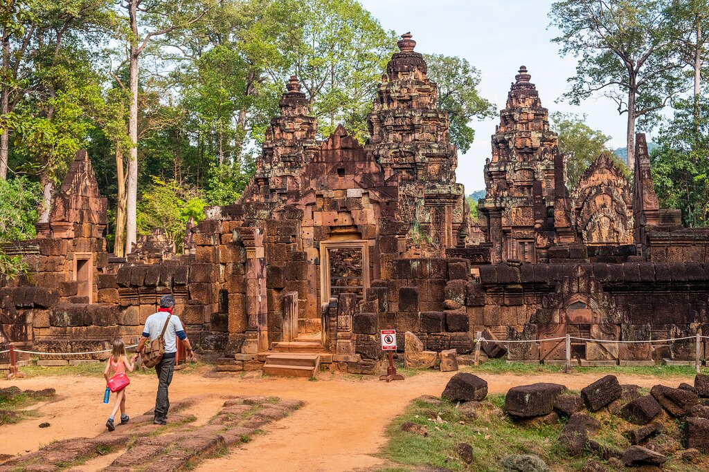 Today, focus your sights on lesser-known temples scattered around the periphery of Angkor. Begin by traveling through the Cambodian countryside to the semi-ruined, moated hilltop temple complex of Chau Srei Vibol, where giant banyan trees have spread their tentacles through and around the many buildings. Then continue north to the recently restored Banteay Srei temple, dedicated to the Hindu god Shiva and made of pink sandstone adorned with elaborately and well-preserved decorative carvings. You’ll then stop for a tasty Khmer lunch before heading back toward Siem Reap to visit Banteay Samre.