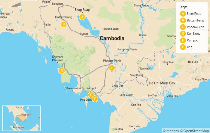 Map of Siem Reap to the Coast: Battambang, Phnom Penh, Koh Kong, Kampot & Kep – 14 Days