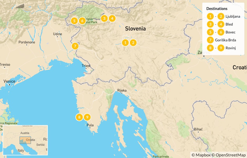 Map of Slovenia & Croatia Scenic Road Trip: Ljubljana, Lake Bled, Soča Valley & the Istrian Peninsula – 10 Days