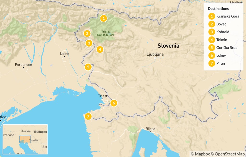 The trail then descends to sea level as you approach the coastal city of Koper, where you’ll continue to pedal along the Rižana River, following the Parenzana Track, a now-defunct railway track, through some tunnels to reach the Venetian-style city of Piran. Set at the tip of a narrow peninsula, Piran’s Old Town is one of the best-preserved in the Adriatic. Celebrate the end of your journey with a refreshing dip in the sea and a delicious seafood dinner.