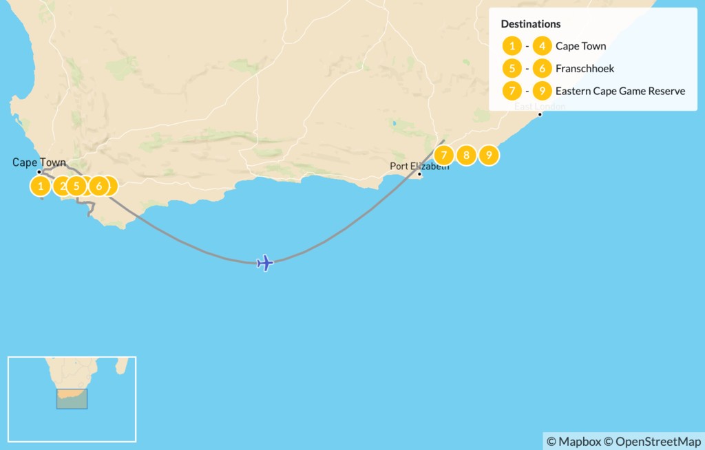 Map of South Africa Adventure: Cape Town, Winelands, & Eastern Cape Safari – 10 Days