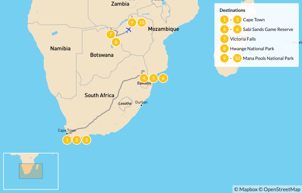 Map of South Africa and Zimbabwe Safari: Cape Town, Victoria Falls, Hwange National Park, Mana Pools National Park, & More – 11 Days