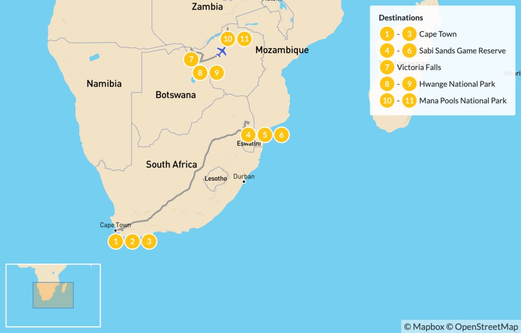 Map of South Africa and Zimbabwe Safari: Cape Town, Victoria Falls, Hwange National Park, Mana Pools National Park, & More – 12 Days