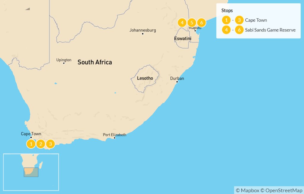 Map of South Africa Coastal & Safari Highlights: Cape Town & Sabi Sands – 7 Days