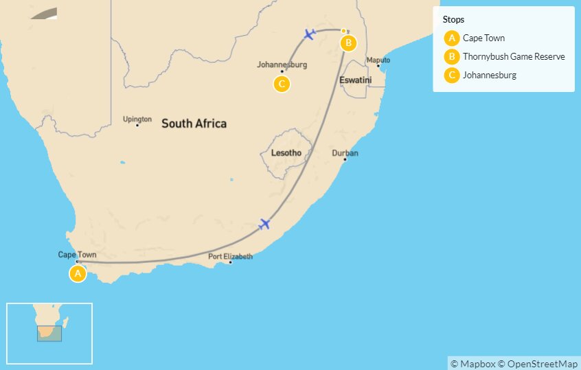 Map of South Africa Culture & Safari: Cape Town & Thornybush Game Reserve- 9 Days