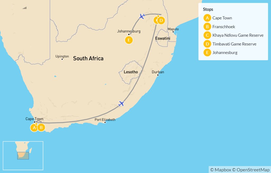Map of South Africa Culture, Wildlife, Food & Wine Discovery Tour- 16 Days