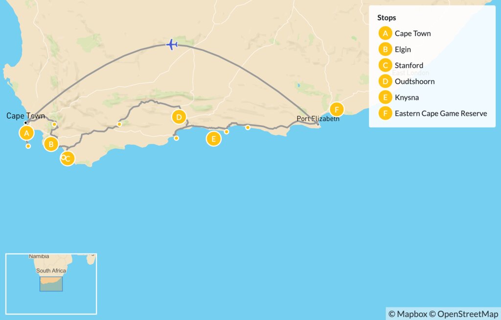 Map of South Africa Family Adventure: Cape Town, Winelands, Garden Route & Safari – 14 Days