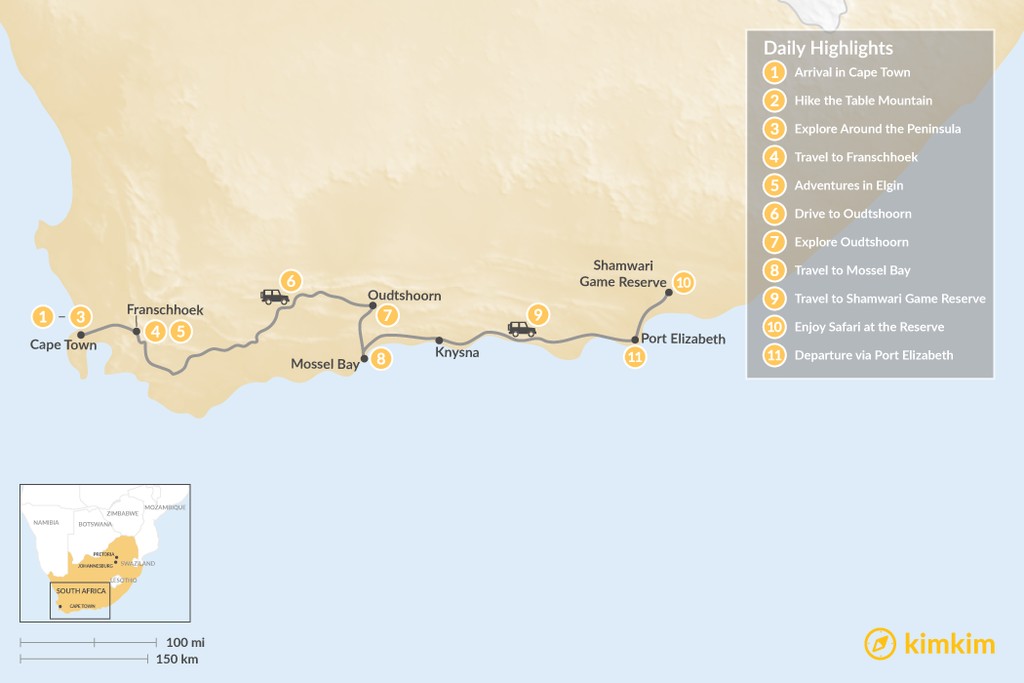 Map of South Africa Family Adventure: Cape Town, Winelands, Garden Route, Safari, & More – 11 Days