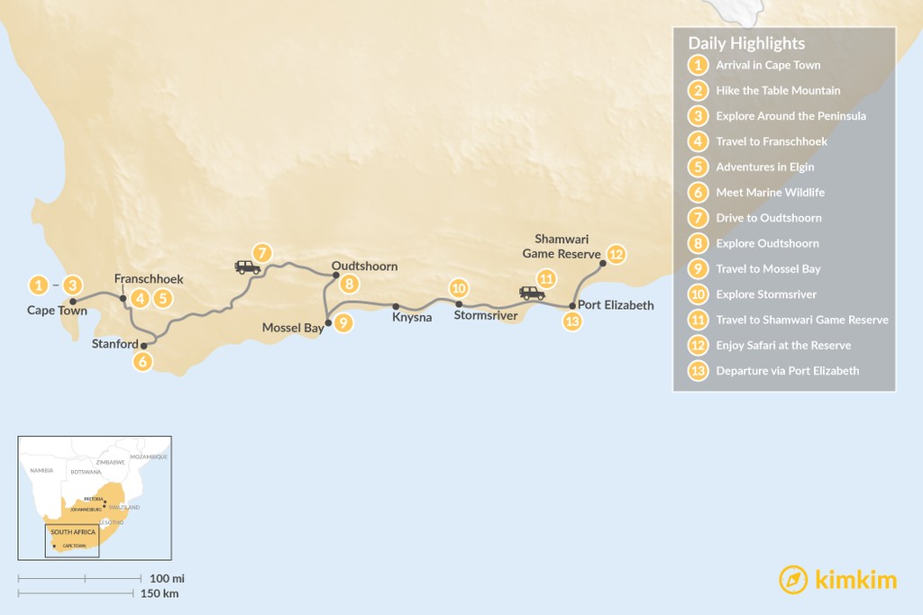 Map of South Africa Family Adventure: Cape Town, Winelands, Garden Route, Safari, & More – 13 Days