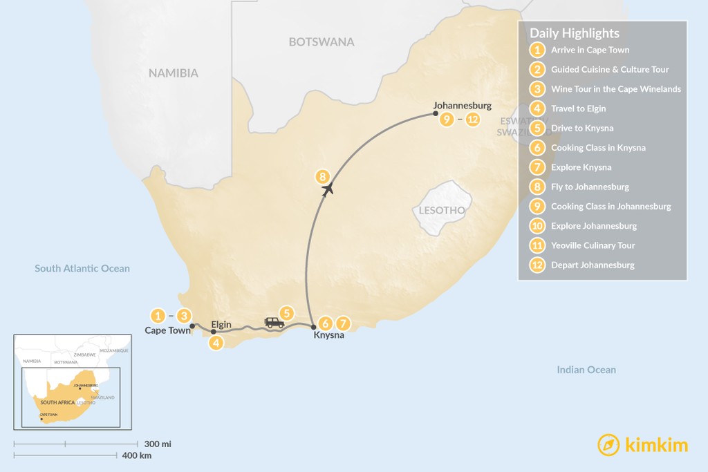 Map of South Africa Food & Wine Tour: Cape Town, Garden Route & Johannesburg – 12 Days