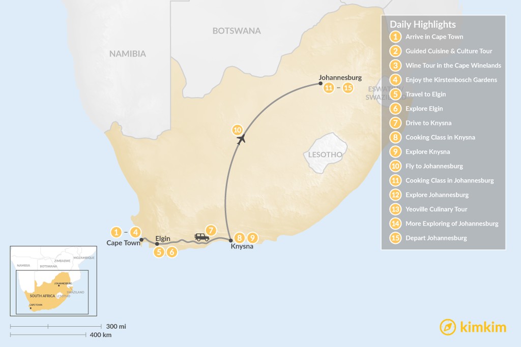 Map of South Africa Food & Wine Tour: Cape Town, Garden Route, & Johannesburg – 15 Days