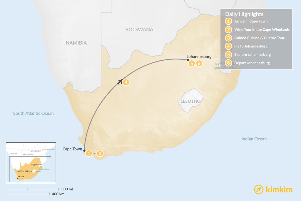 Map of South Africa Food & Wine Tour: Cape Town, Winelands, & Johannesburg – 6 Days