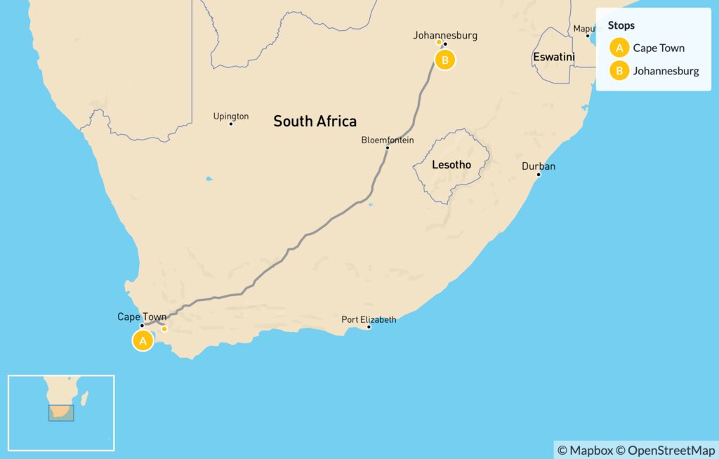 Map of South Africa Food & Wine Tour: Cape Town, Winelands & Johannesburg – 7 Days