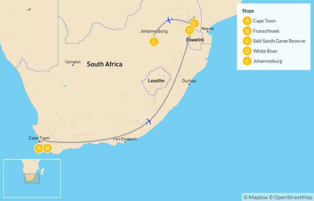 Map of South Africa Luxury Safari: Cape Town, Winelands, Sabi Sands & White River – 10 Days