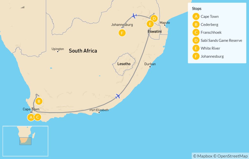 Map of South Africa Luxury Safari: City, Wine & Wilderness Adventures – 14 Days