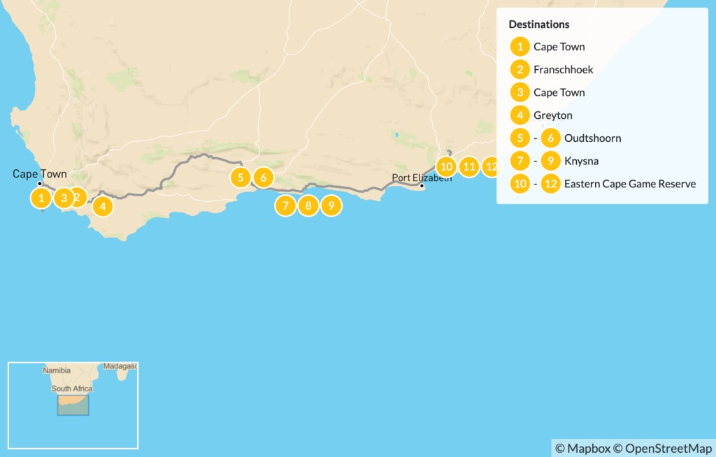 Map of South Africa Road Trip: Cape Town, Winelands, Garden Route, & Eastern Cape Safari – 13 Days