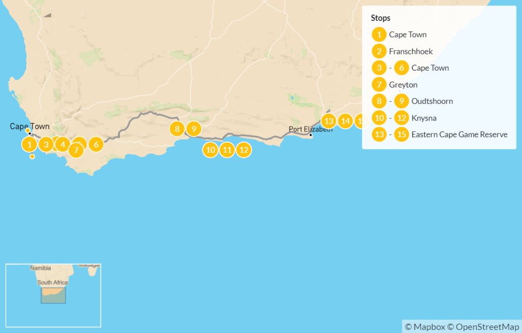 Map of South Africa Road Trip: Cape Town, Winelands, Garden Route & Eastern Cape Safari – 16 Days