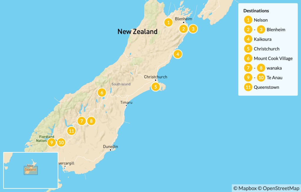 Map of South Island Highlights & New Zealand Wines – 12 Days