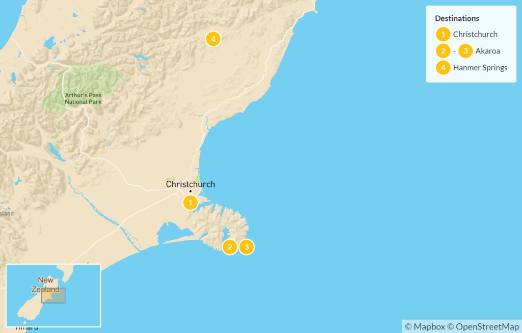 Map of South Island Tour: Christchurch, Akaroa & Hanmer Springs – 5 Days