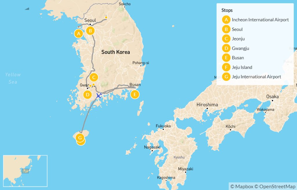 Map of South Korea Culinary Adventure: Seoul, Jeonju, Gwangju, Busan & Jeju – 13 Days