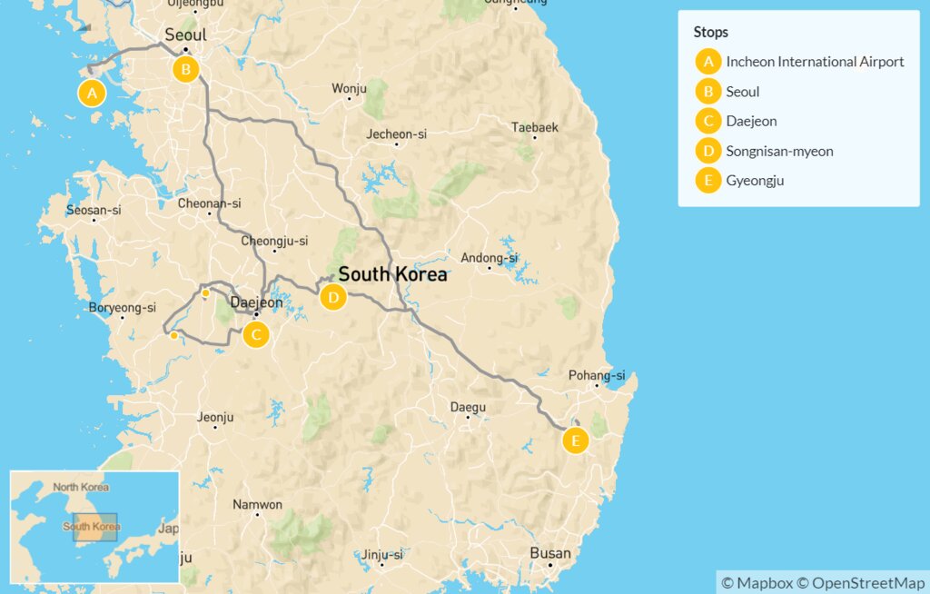 Map of South Korea’s UNESCO Treasures & Temple Stay – 10 Days