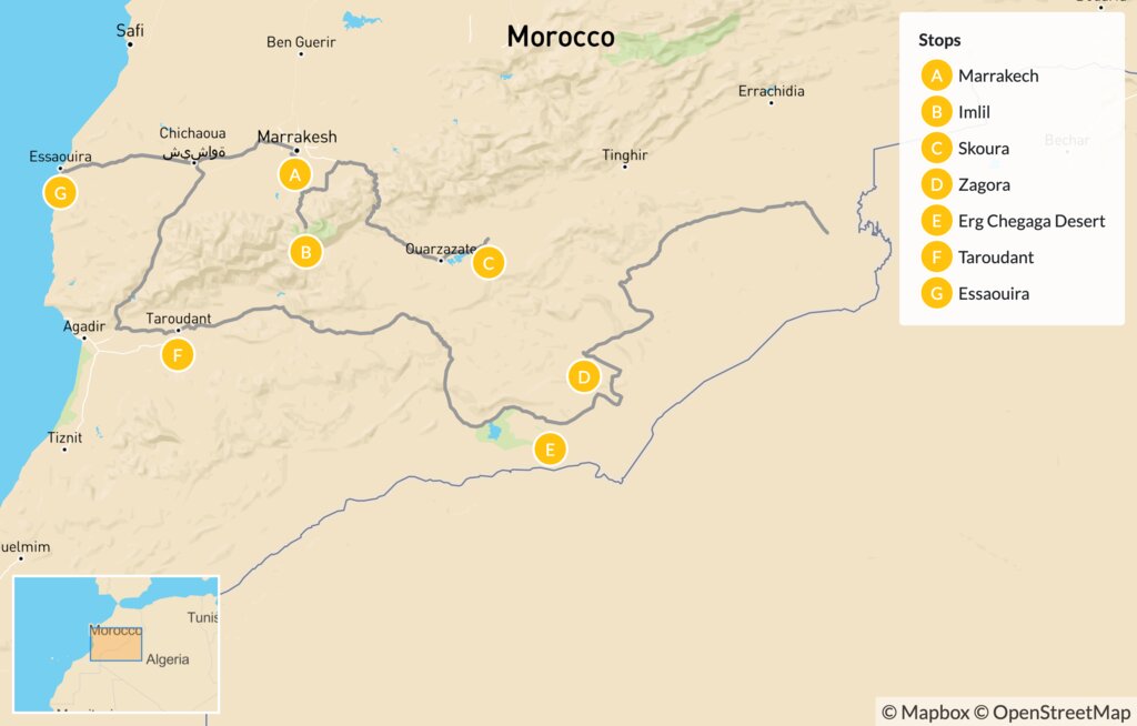 Map of South Morocco Adventure: Marrakesh to Essaouira, Imlil, Skoura & Erg Chigaga – 14 Days