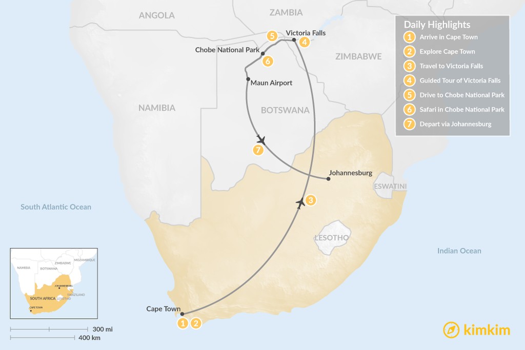 Map of Southern Africa Safari: Cape Town, Victoria Falls, & Chobe National Park – 7 Days