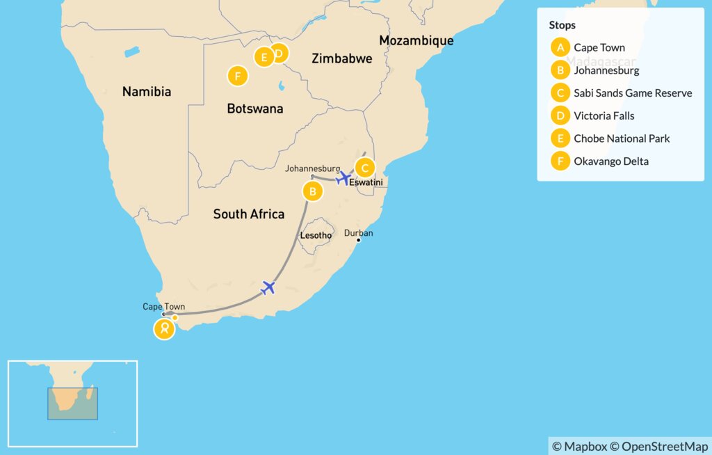 Map of Southern Africa Safari: Cape Town, Victoria Falls, Chobe National Park & More – 14 Days