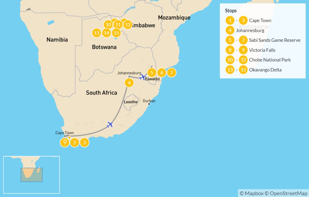 Map of Southern Africa Safari: Cape Town, Victoria Falls, Chobe National Park & More – 16 Days