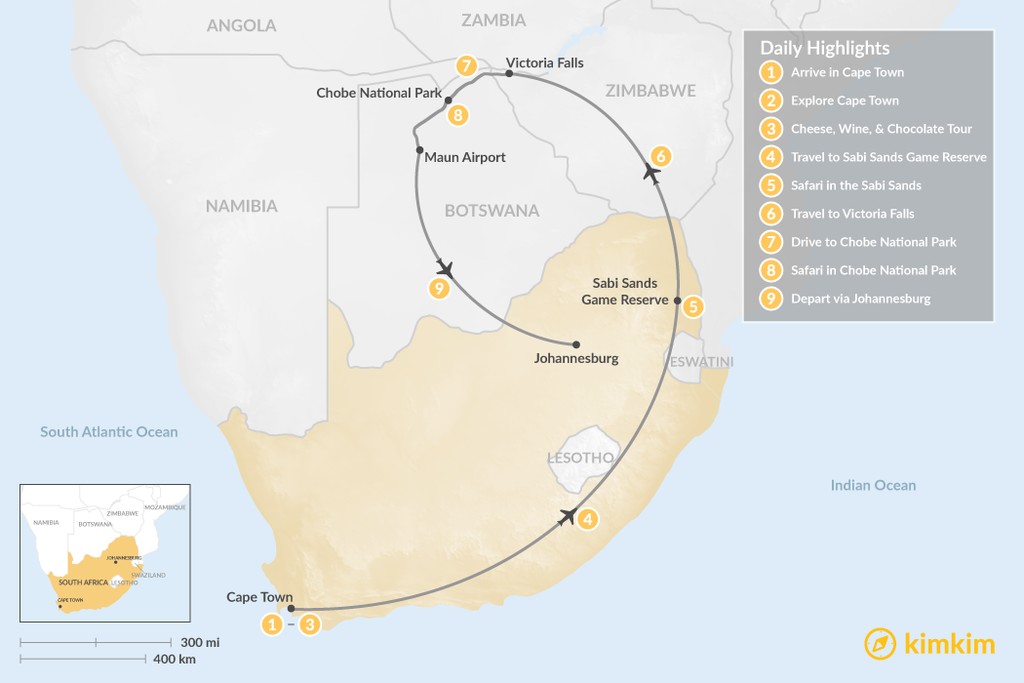 Map of Southern Africa Safari: Cape Town, Victoria Falls, Chobe National Park, & More – 9 Days
