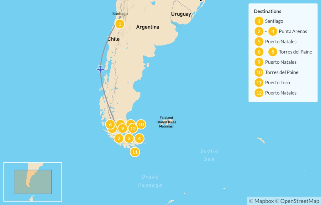 Map of Southern Chile: Patagonian W Trek, Wildlife, & Wilderness Adventure – 13 Days