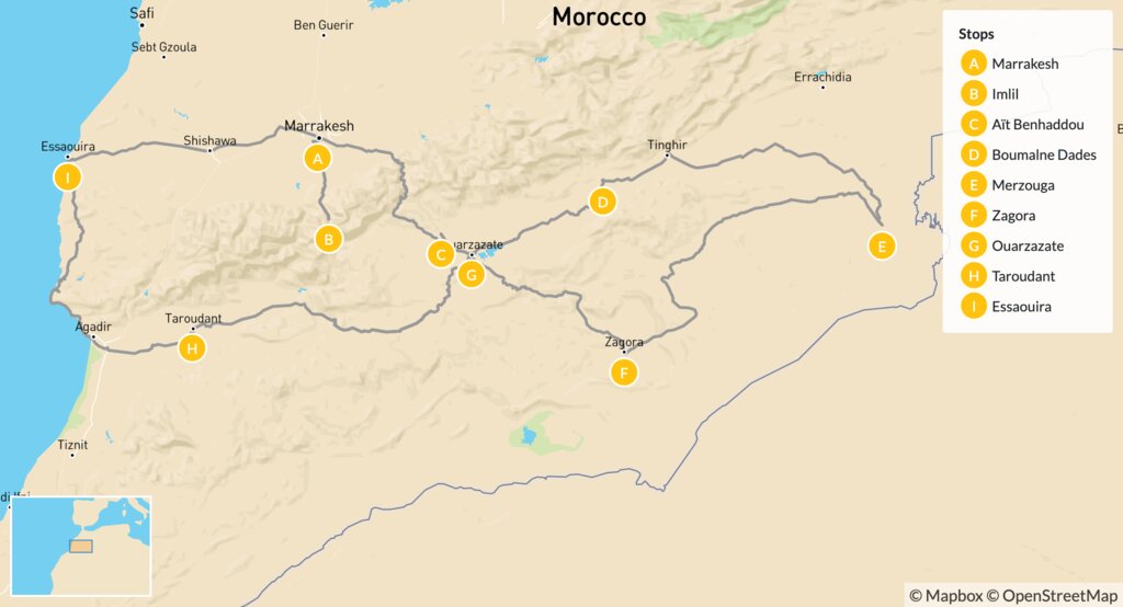 Map of Southern Morocco Adventure: Sahara Desert, Atlas Mountains & Atlantic Ocean – 16 Days