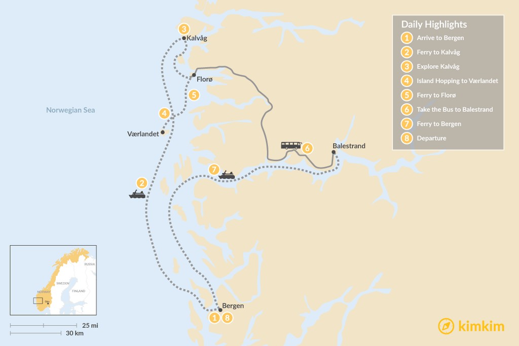 | Day 2 | Bergen – Ferry to Kalvåg | Kalvåg |