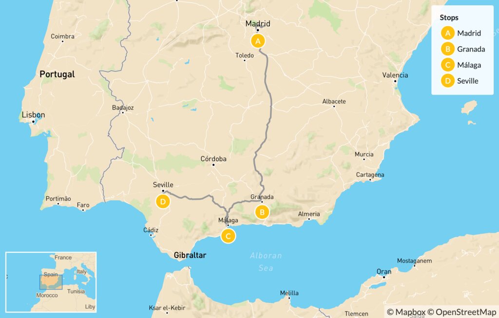 Map of Southern Spain Family Aventure from Madrid – 10 Days