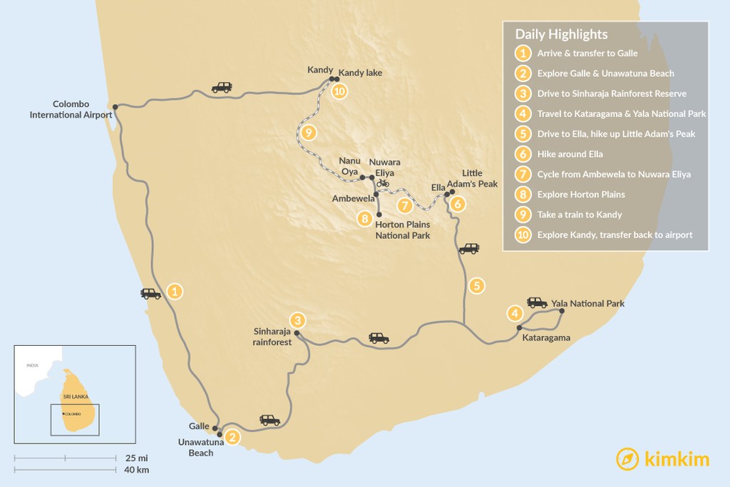 Map of Southern Sri Lanka: Active Adventure – 10 Days