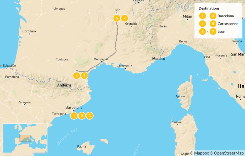 Map of Spain and France Road Trip: Barcelona, Carcassonne, & Lyon – 8 Days