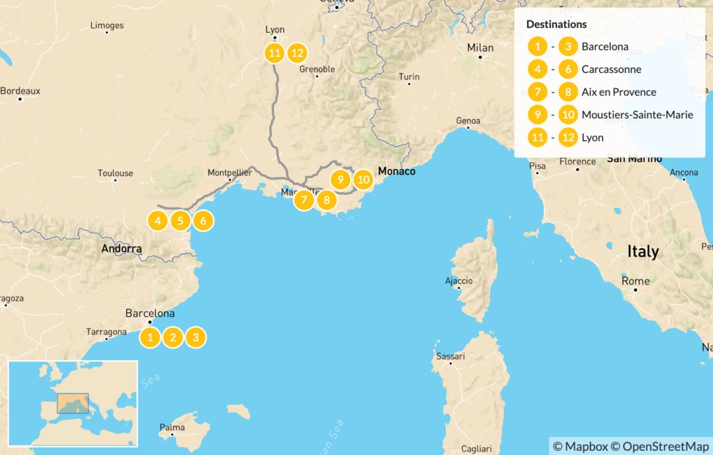 Map of Spain and France Road Trip: Barcelona, Carcassonne, Verdon Gorge, Aix-en-Provence, Lyon, & More – 13 Days