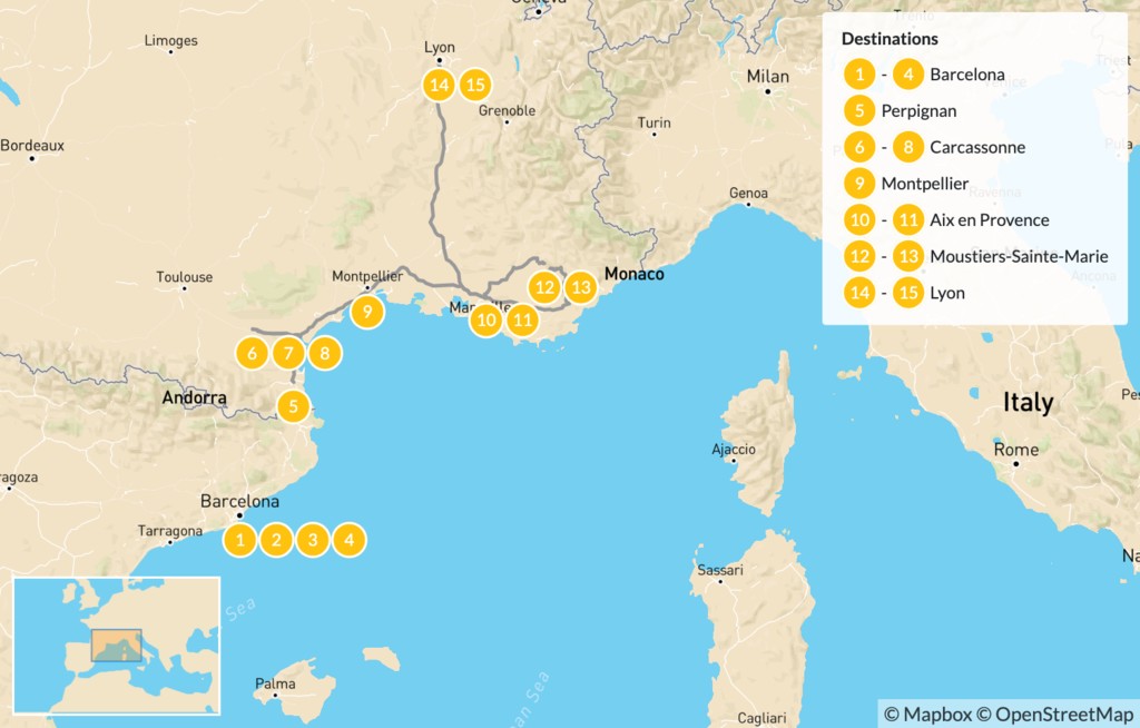 Map of Spain and France Road Trip: Barcelona, Carcassonne, Verdon Gorge, Aix-en-Provence, Lyon, & More – 16 Days