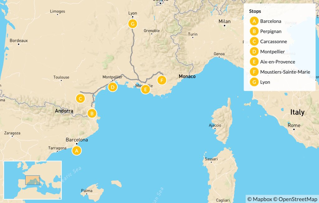 Map of Spain & France Road Trip: Barcelona, Carcassonne, Montpellier, Provence & Lyon – 21 Days