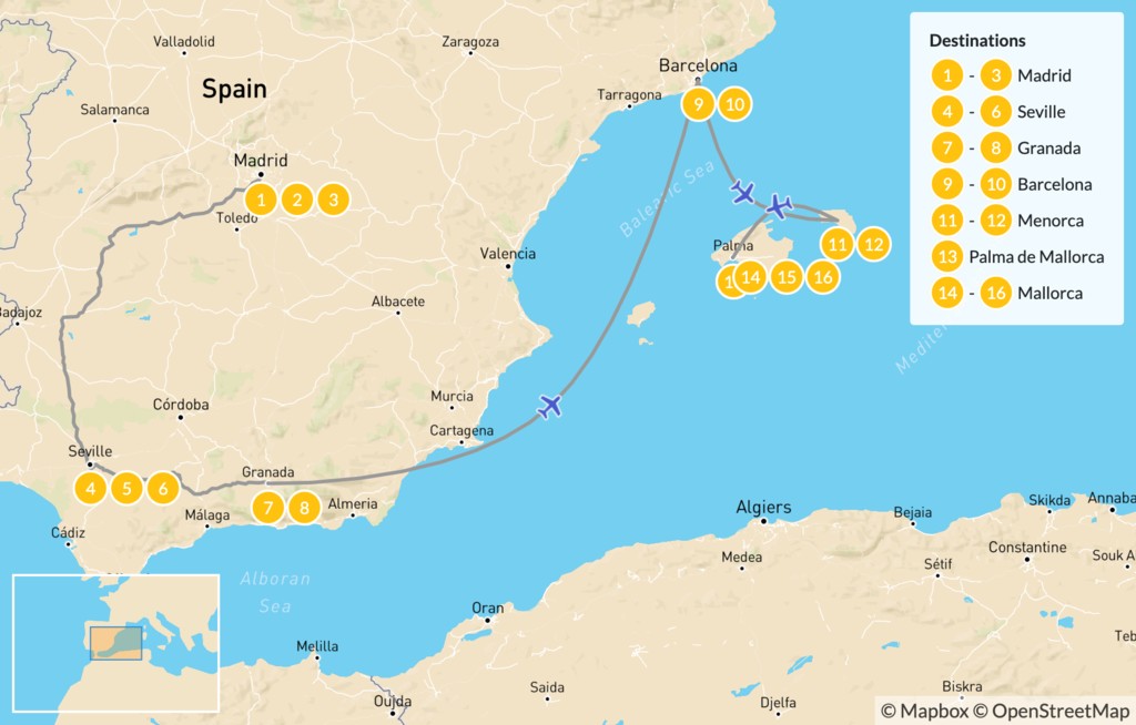Map of Spain Highlights: Madrid, Andalusia, Barcelona, & the Balearic Islands – 17 Days