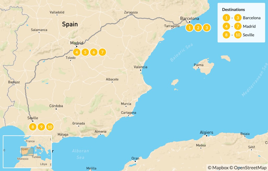 Map of Spain Luxury Tour: Barcelona, Madrid, & Seville – 11 Days